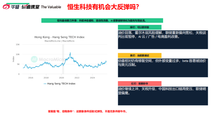 对于今年大跌的恒科指数及,言财老师称其能否反转,取决于三大条件同时改善:油价回落、关税压力缓和、AI叙事转化为真实盈利。当前仍处“黄灯”状态——估值有修复空间,但beta易受外部冲击压制。