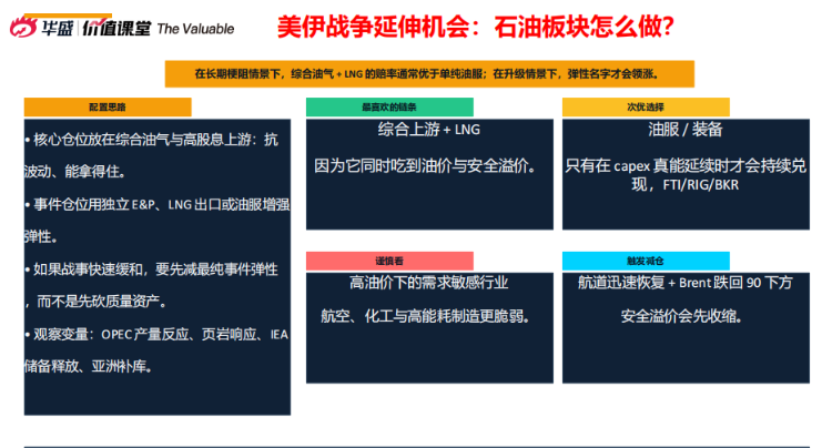 - 石油板块:核心仓位聚焦综合油气 + LNG 龙头(吃油价与安全溢价双重红利),事件仓位搭配独立 E&P 标的增强弹性,谨慎看待航空、化工等油价敏感行业;