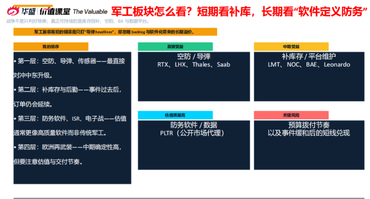 - 军工板块:短期看空防、导弹的直接事件驱动,中长期锚定 “软件定义防务”,重点关注补库存、防务软件、欧洲再武装方向,优选现金流稳定、订单积压充足的标的。