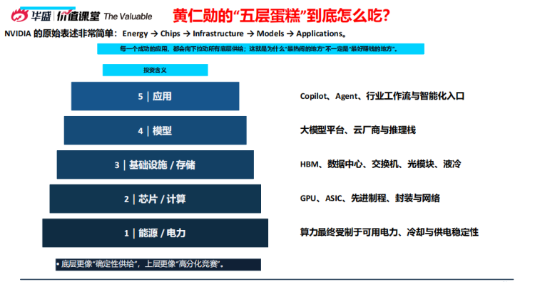 二、AI 五层蛋糕:底部三层胜率最高,上层精选有护城河标的