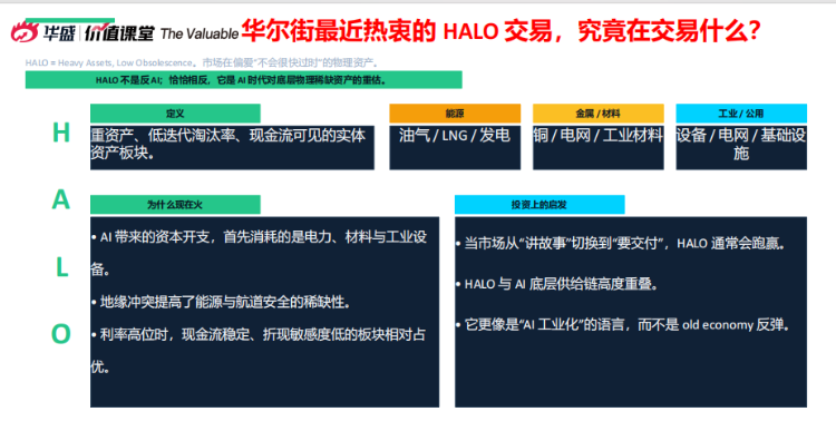 这对资产价格意味着:长久期科技股承压,而现金流稳定、折现敏感度低的HALO资产(Heavy Assets, Low Obsolescence)相对占优。