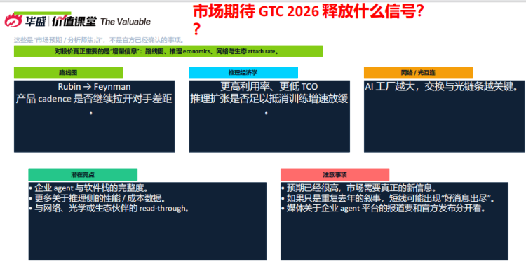 本次 GTC 大会核心看点并非单一新品,而是NVIDIA 能否证明 AI 工厂建设仍处扩张早期,且生态能在训练之外实现盈利,官方焦点明确为 AI 工厂、Physical AI、Agentic AI、推理效率四大方向。对股价而言,推理需求的规模化证据、AI 工厂全栈方案的 attach rate 提升、生态向非四大云厂商扩散,是核心利好;若仅重复旧叙事,或引发 “利好出尽” 的短线调整。GTC 的外溢效应将覆盖全产业链:推理侧利好 ASIC、网络互连标的,Physical AI 则推动机器人、工业自动化板块的长久期机会,上游算力、中游控制系统、下游场景落地均有望受益。