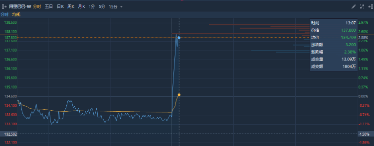 阿里巴巴午后短线拉升,现涨超2%,此前一度跌近1%,成交额超53亿港元,美股夜盘涨幅扩大至近3%。