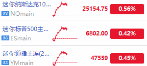 盘前,美股三大期指普涨,纳指期货 $NQmain 涨0.56%,标普500期货 $ESmain 涨0.42%,道指期货 $YMmain 涨0.45%。