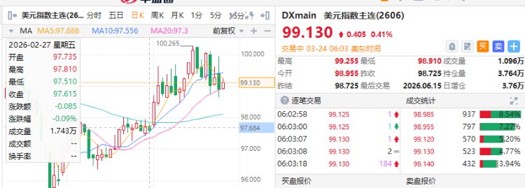历史上,地缘冲突中资金通常同时涌入黄金和美元。但本次冲突的特殊之处在于:由于全球近八成石油贸易以美元结算,霍尔木兹海峡危机推升油价→市场需要更多美元进行交易→美元指数被动走强。自冲突爆发以来,美元指数从97附近飙升至99以上。