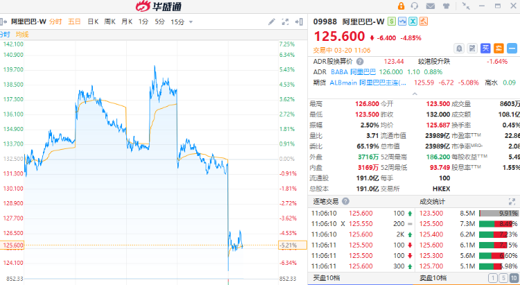 3月20日消息,阿里巴巴盘中跌超6%,最低触及123.5港元,创去年8月以来新低;阿里巴巴美股隔夜收跌超7%,报124.9美元。