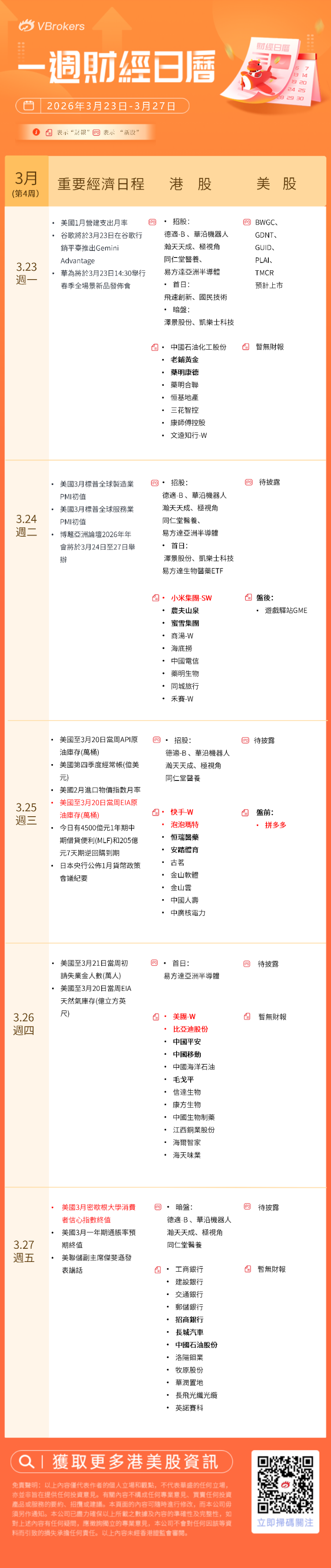 1、港股方面,可关注: 周一(3.23):