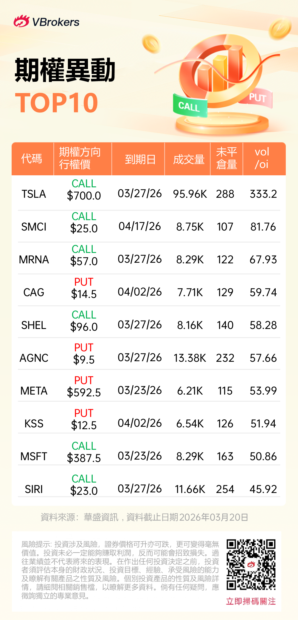 - 一看涨期权(TSLA_260327_CALL_700.0 )Vol/OI 比率高达333.2,成交量达9.6万张,未平仓量288张,行权价为700.0美元,行权日在2026-03-27,该张期权涨0.0%。