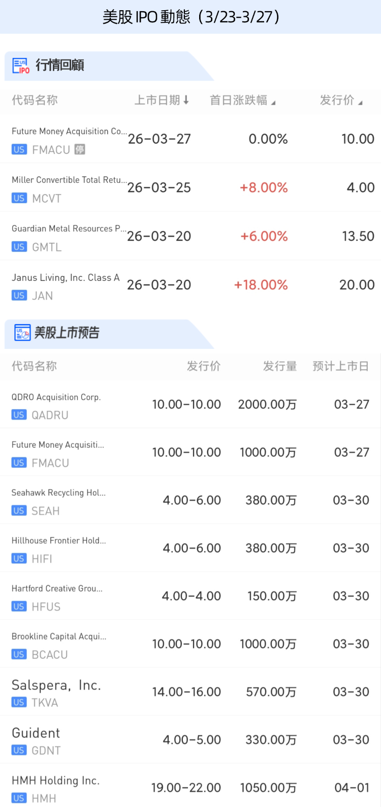 美股方面,本周有3只新股上市;下周美股预计将有7只新股挂牌上市。