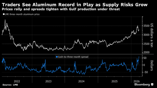 贸易商和行业高管此前已警告,如果霍尔木兹海峡航运不能很快恢复,不可避免的减产将推动铝价突破2022年创下的每吨4,073.50美元的纪录高位。