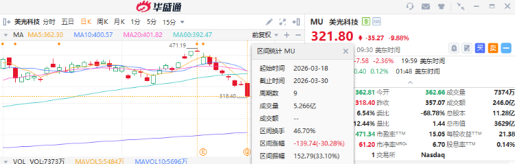 华盛资讯3月31日消息,近期,存储概念经历了一轮巨大回调!美光科技自3月18日的最高点以来,累跌超30%!其他概念股也无一幸免,自进入这轮回调区间以来,SanDisk $SNDK 也录得了近26%的跌幅,西部数据同步跌超20%。