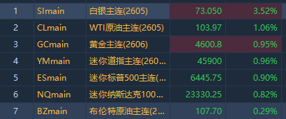相关标的: $NQmain 、 $ESmain 、 $YMmain 、 $BZmain 、 $CLmain 、 $GCmain 、 $SImain