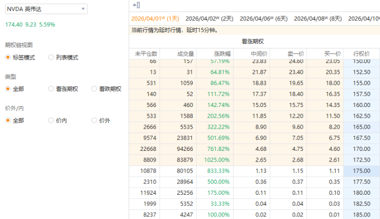 其中一看涨期权(NVDA_260401_C_170.0)交易量达9.43万张,该合约行权价为170.0美元,行权日在2026-04-01,该张期权涨761.82%。