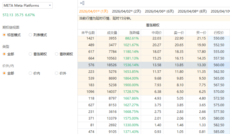 - 一看涨期权(META_260401_CALL_572.5 )Vol/OI 比率高达74.55,成交量达0.88万张,未平仓量118张,行权价为572.5美元,行权日在2026-04-01,该张期权涨1667.86%。
