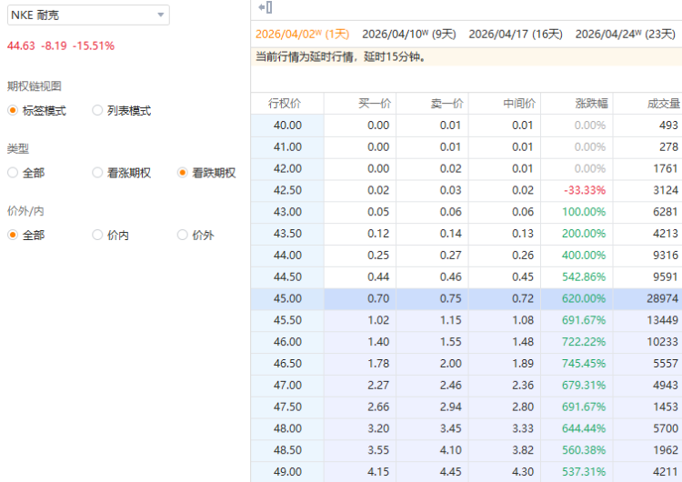 其中一看跌期权(NKE_260402_P_45.0)交易量达2.9万张,该合约行权价为45.0美元,行权日在2026-04-02,该张期权涨620.0%。