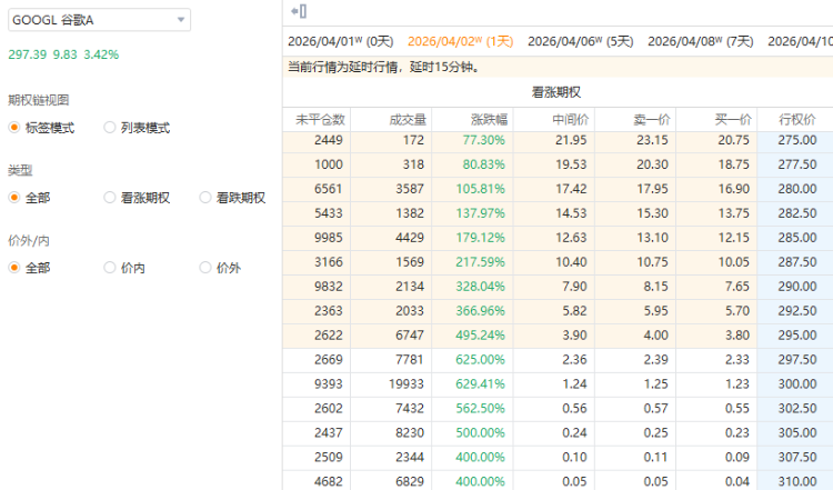 其中一看涨期权(GOOGL_260402_C_300.0)交易量达1.99万张,该合约行权价为300.0美元,行权日在2026-04-02,该张期权涨629.41%。