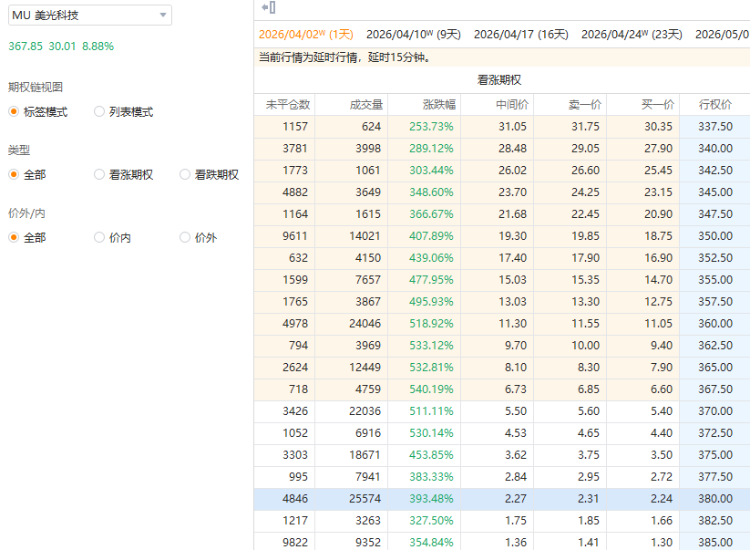其中一看涨期权(MU_260402_C_380.0)交易量达2.56万张,该合约行权价为380.0美元,行权日在2026-04-02,该张期权涨393.48%。其他多张Call单也大涨超500%