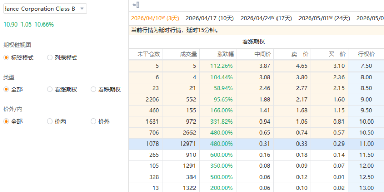 其中一看涨期权(PSKY_260410_C_11.0)交易量达1.3万张,该合约行权价为11.0美元,行权日在2026-04-10,该张期权涨480.0%。