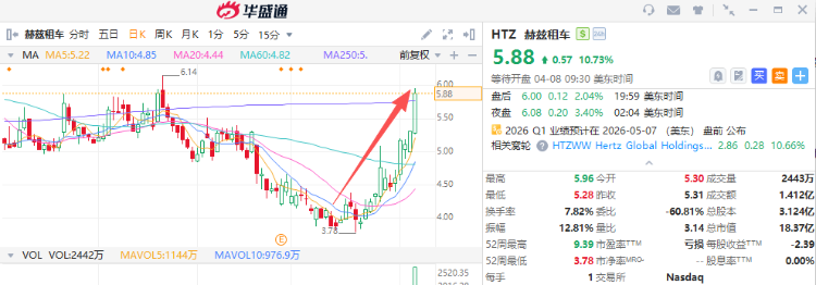 5、赫兹租车:隔夜涨10.73%,收盘价报5.88美元