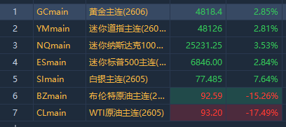 相关标的: $NQmain 、 $ESmain 、 $YMmain 、 $CLmain 、 $BZmain 、 $GCmain 、 $SImain