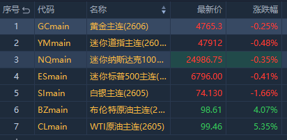 相关标的: $NQmain 、 $ESmain 、 $YMmain 、 $CLmain 、 $BZmain 、 $GCmain 、 $SImain