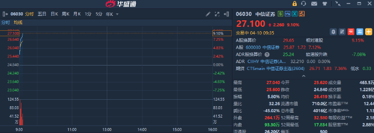 华盛资讯4月10日讯,港股券商股集体走高,中信证券大涨逾9%,国泰海通、广发证券涨近5%,招商证券、中国银河、中金公司涨逾4%。