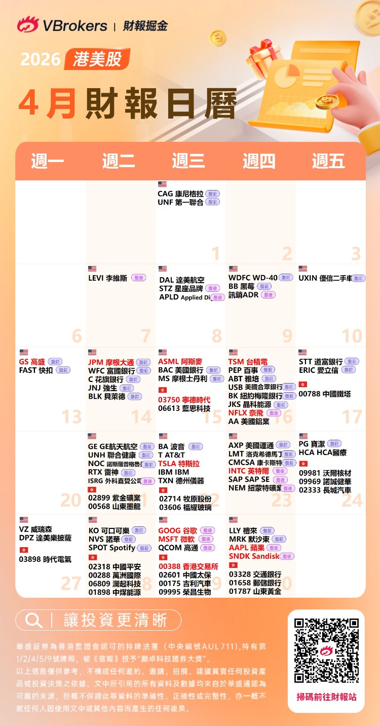 4月,港美股正式进入2026年Q1财报季!美股、港股均有明星公司相继发布财报,一起来看看最新财报披露进程~