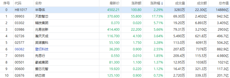 华盛资讯4月13日讯,港股半导体股普涨!天数智芯涨超17%,澜起科技涨超11%,兆易创新涨超5%,英诺赛科涨超3%,壁仞科技涨超2%,豪威集团涨超1%。