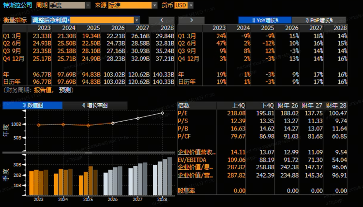 汇丰对特斯拉维持“卖出”评级,并将目标价从133美元进一步下调至119美元,较当前股价跌幅接近70%;也被视为华尔街对该公司最悲观的声音之一。该行的核心论点为市场给予特斯拉的AI和Robotaxi估值溢价“完全不合理”,并认为其本质上仍受制于汽车业务的周期性风险。
