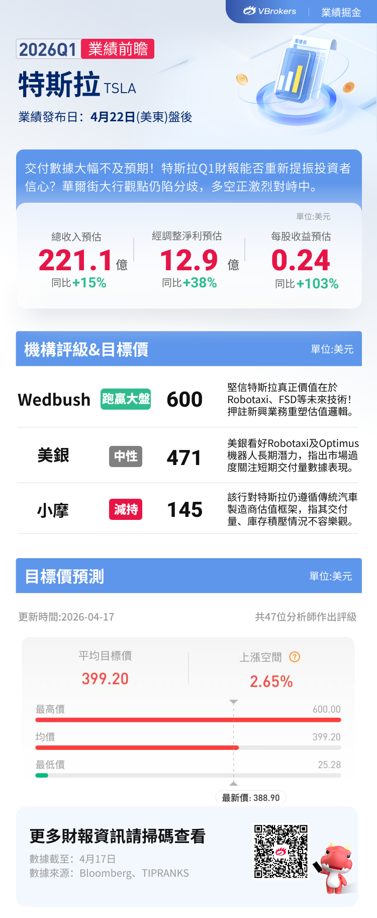 4月初,特斯拉已公布交付数据,整体表现大幅不及市场预期,引发股价单日跳水逾5%。同时,小摩、高盛等大行亦进一步下调目标价。