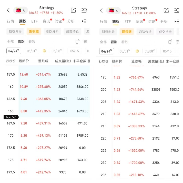 多张看涨期权大涨,还有多张期权涨超1000%。其中成交量最大的为一看涨期权(MSTR_260424_C_170.0)交易量达4.11万张,该合约行权价为170.0美元,行权日在2026-04-24,该张期权涨439.13%。行权价(170)与现价(166.52)极近,且到期日(4月24日)迫在眉睫。这 4.11 万张成交是市场最敏感的先行指标——只要周一站稳 170 美元,这些期权或产生巨大的“Gamma 挤压”推动股价进一步飞升。