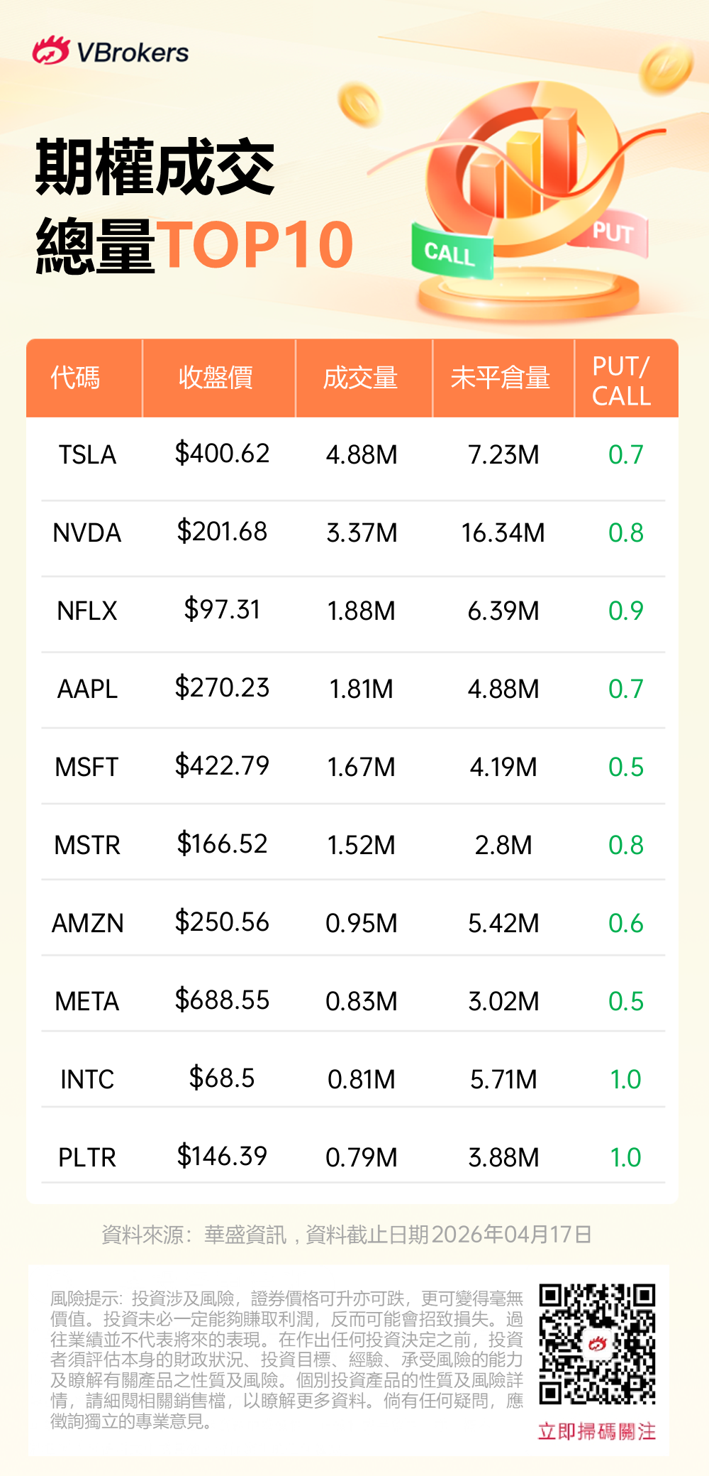 其中一看涨期权(NFLX_260424_C_100.0)交易量达5.57万张,该合约行权价为100.0美元,行权日在2026-04-24,该张期权跌91.67%。