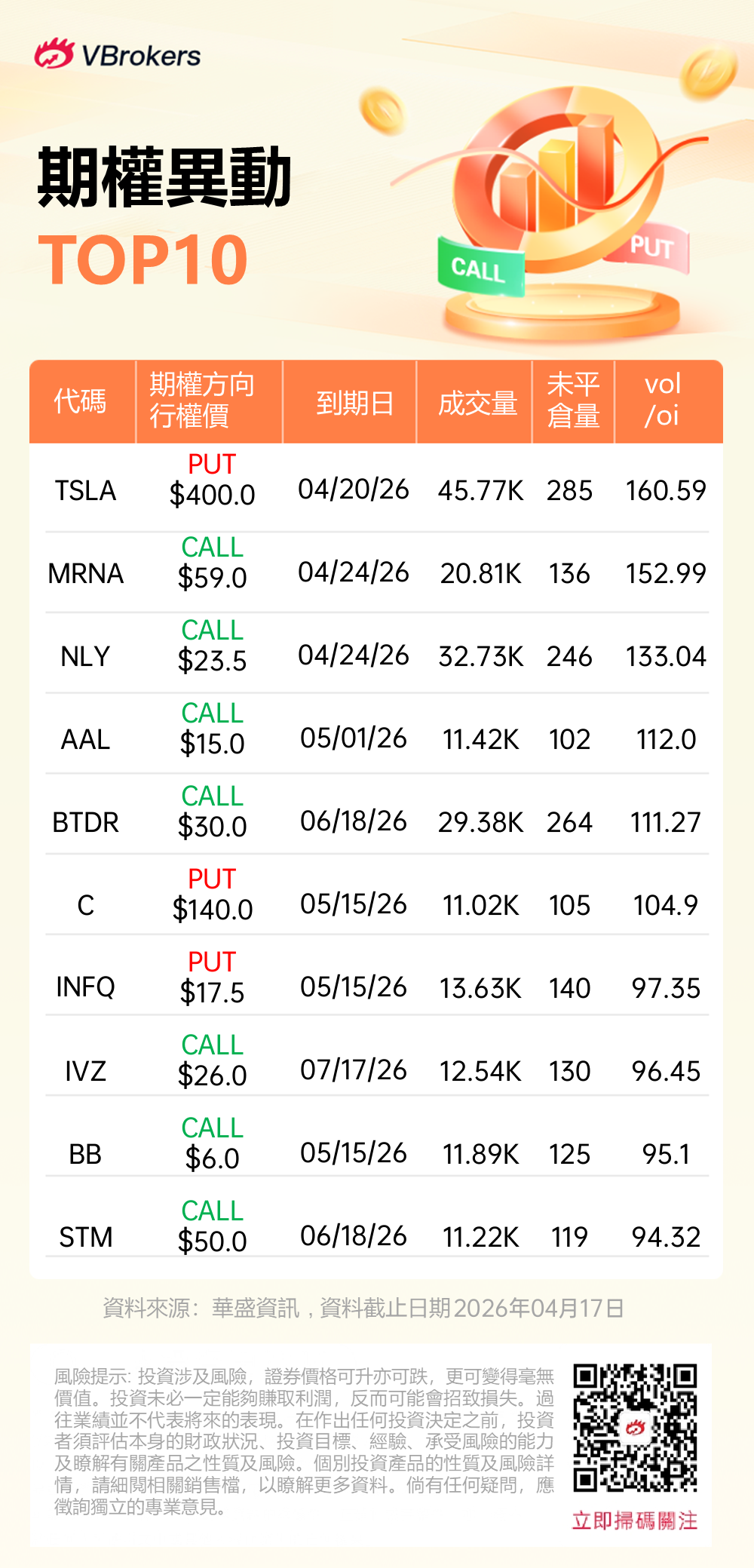 - 一看跌期权(TSLA_260420_PUT_400.0 )Vol/OI 比率高达160.59,成交量达4.58万张,未平仓量285张,行权价为400.0美元,行权日在2026-04-20,该张期权跌65.6%。
