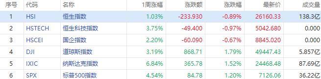 港股方面,本周恒生指数涨幅1.03%,报26160.33点;恒生科技指数涨幅3.75%,重回5000点上方,报5042.68点;国企指数涨幅2.2%,报8845.02点。