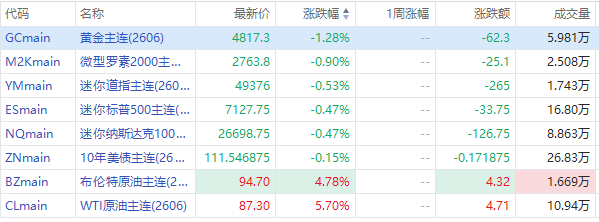 美股三大期指周一盘前齐跌,纳指期货 $NQmain 跌0.47%,道指期货 $YMmain 跌0.53%,标普500期货 $ESmain 跌0.47%。原油期货 $CLmain 大涨近6%。