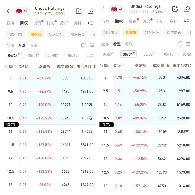 成交量第二大的期权为一看涨期权(ONDS_260501_C_11.0 )交易量达1.91万张,未平仓量2.58万,该合约行权价为11.0美元,行权日在2026-05-01,该张期权涨103.13%。