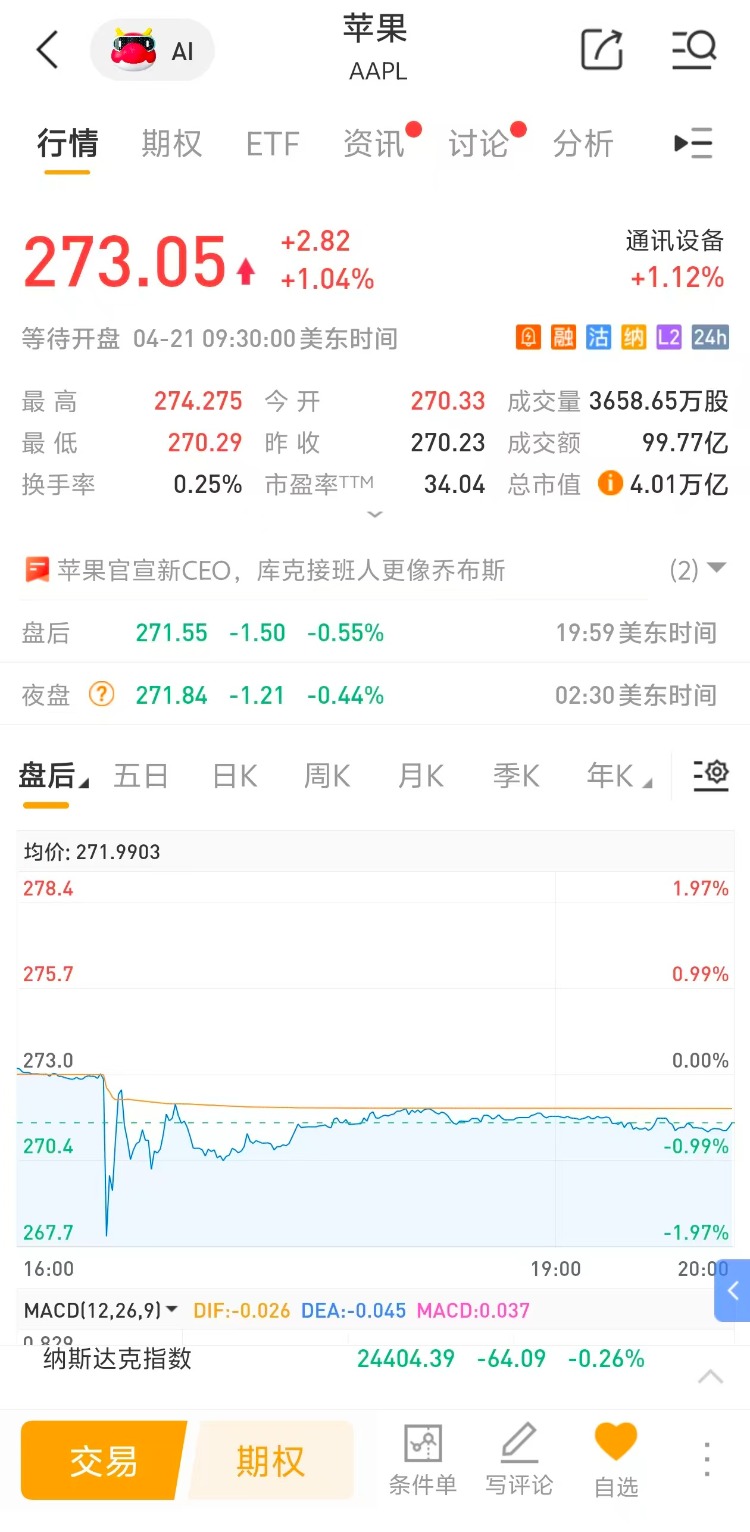 1、苹果:隔夜涨1.04%,收盘价报273.05美元