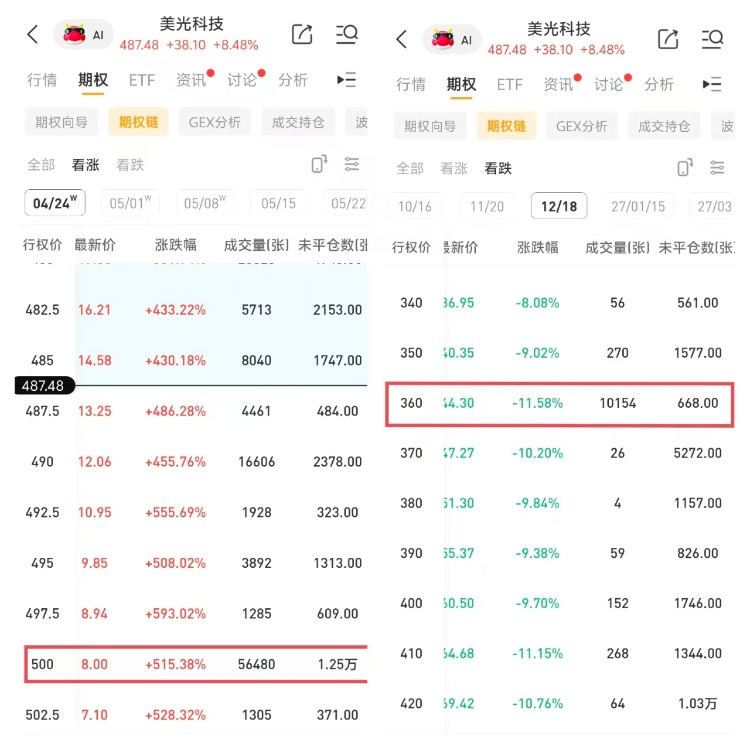 多张看涨期权大涨,成交量最大的期权为一看涨期权(MU_260424_C_500.0)交易量达5.65万张,该合约行权价为500.0美元,行权日在2026-04-24,该张期权涨515.38%。
