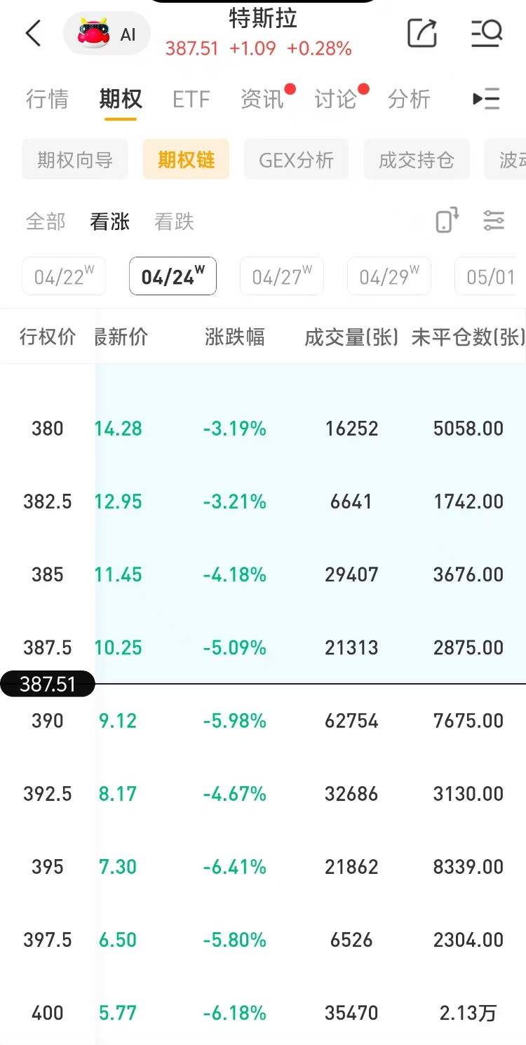其中一看涨期权(TSLA_260424_C_390.0)交易量达6.28万张,该合约行权价为390.0美元,行权日在2026-04-24,该张期权跌5.98%。这笔 6.28 万张的巨单在财报前买入,博弈的是股价冲破 390 美元关口。然而,盘后股价在 403 美元(涨 5%)到 386 美元(跌 0.3%)之间剧烈震荡,随着时间价值流逝,这批末日看涨期权面临极高的波动率溢价回落(IV Crush)风险。