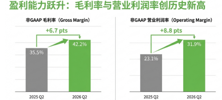 利润率方面,FY26Q2非GAAP毛利率已达46.1%,同比大幅提升7.7个百分点。公司在Q3指引中给出的预估值(47%-48%)意味着毛利率有望再创新高。实际毛利率水平将反映产品结构向高容量、高毛利产品倾斜的成效,投资者可关注最终数据及管理层相关解释。