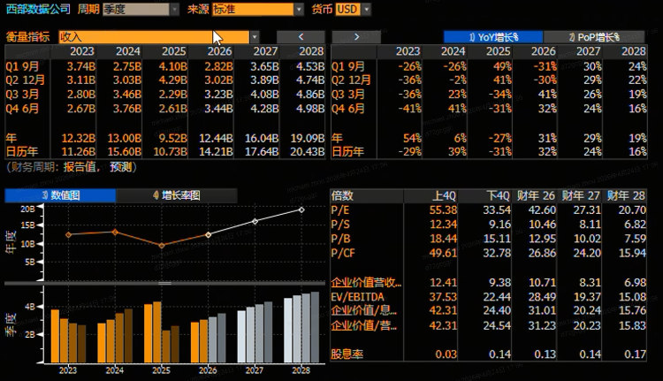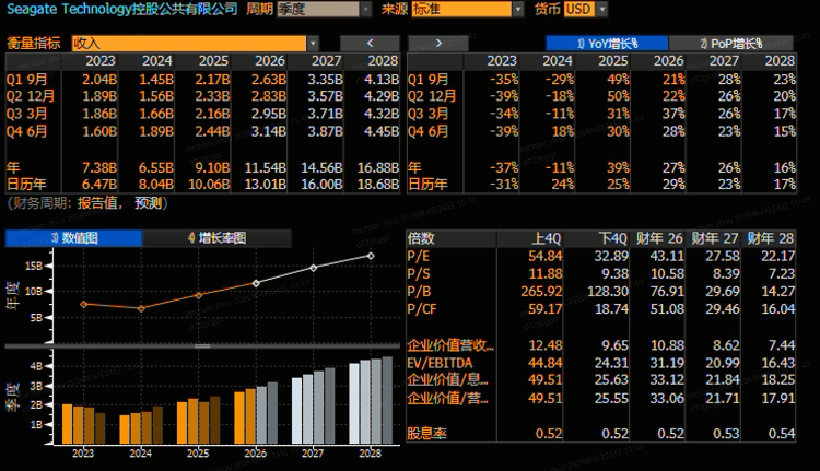 业绩指引及市场预期方面,公司此前于Q2财报发布时给出的Q3营收指引为32亿美元(上下浮动1亿美元);调整后每股收益预计为2.30美元(上下浮动0.15美元)。值得注意的是,华尔街普遍预期公司能够达到甚至超越这一指引!彭博一致预期显示,西部数据26Q3营收或达32.3亿美元,同比增幅约41%;调整后每股收益为2.67美元,同比增约81%。实际业绩与指引的对比,以及与市场更高预期的差距,将是首要关注点。