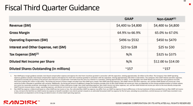 聚焦Sandisk Q3财报,机构普遍关注业绩与指引兑现程度。此前,公司给出的26财年Q3营收指引中值高达46亿美元,非GAAP毛利率指引区间锚定在65%-67%。这一指引大幅超越此前的市场预期,且毛利率指引水平极高。在股价持续大涨后,华尔街对市场Q3业绩的预期也水涨船高:彭博一致预期预计Sandisk Q3营收达到47.1亿美元,同比增幅高达178%;净利润达22亿美元,同比增近214%。投资者可关注实际业绩能否在达成此前指引的同时,进一步超过华尔街预期。
