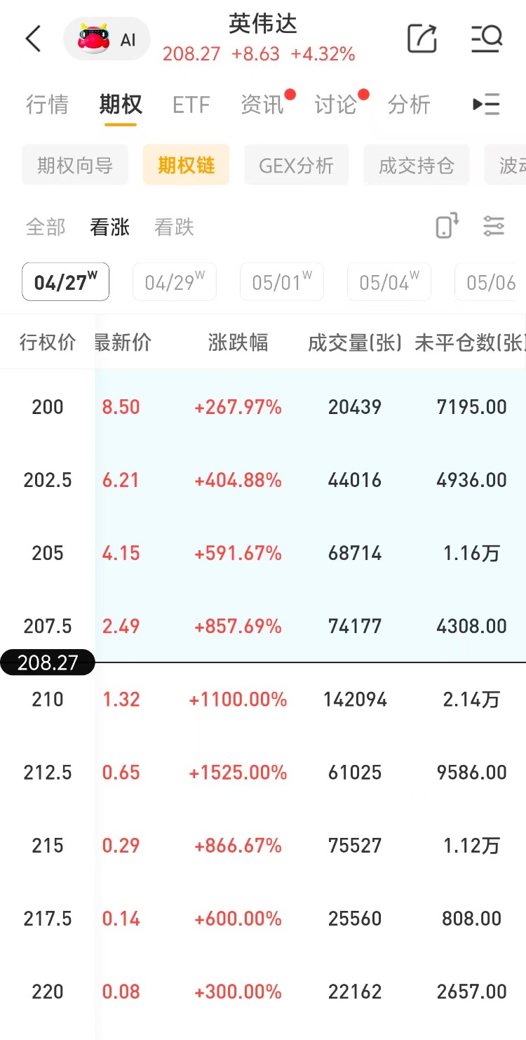 多张看涨期权集体大涨!其中成交量最大的为一看涨期权(NVDA_260427_C_210.0)交易量达14.21万张,该合约行权价为210.0美元,行权日在2026-04-27,该张期权涨1100.0%。
