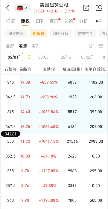 多张看涨期权集体大涨!其中成交量最大的为一看涨期权(AMD_260501_C_350.0)交易量达2.16万张,该合约行权价为350.0美元,行权日在2026-05-01,该张期权涨1046.15%。
