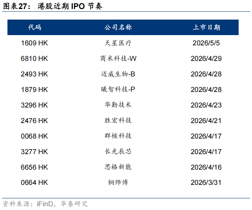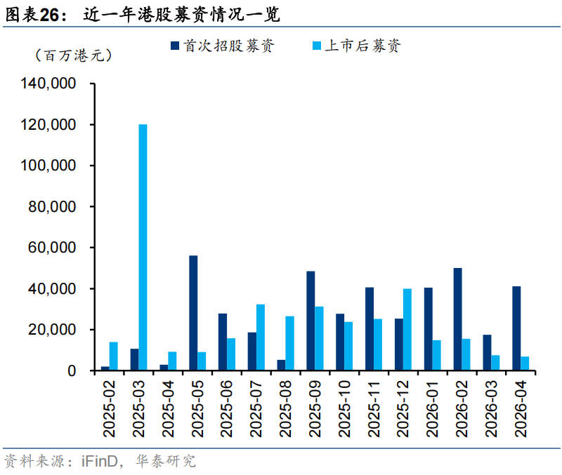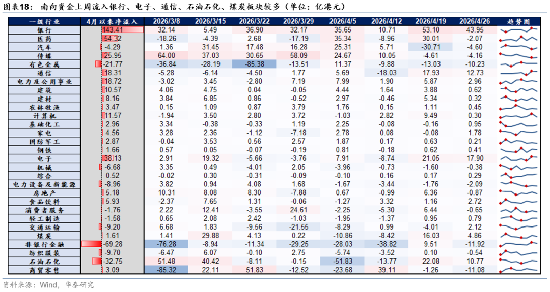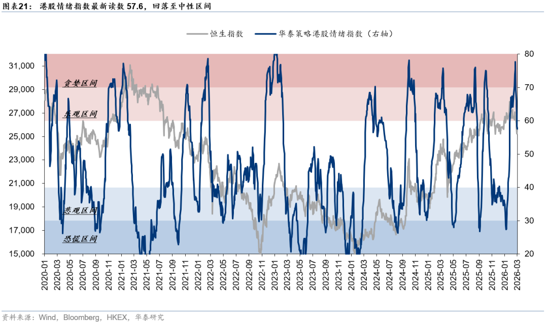 港股情绪已修复至中性水位,中东局势反复等因素使得海外流动性宽松预期有所回撤,叠加假期临近,我们认为,现阶段,港股的上行空间面临制约,关键还是做好结构。我们建议,继续沿着现金流确定性和产业确定性做配置。前者对应继续持有现金流稳定且资本开支压力不大的周期品,如煤炭、铝等以及部分红利低波品种,如部分香港本地股、国有行等。后者对应景气仍在上行趋势的AI链,以美股业绩(本周进入超级周)为锚,建议重点关注半导体(存储等),高风险偏好的投资者可以适度布局云和大模型龙头等。
