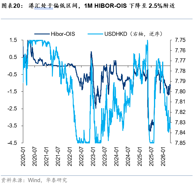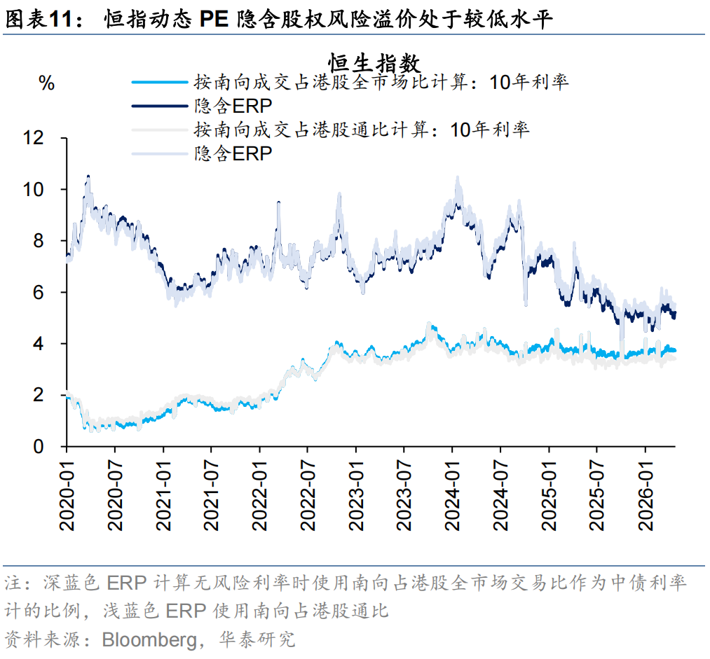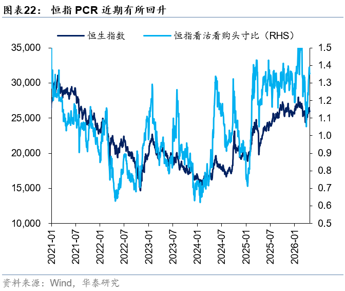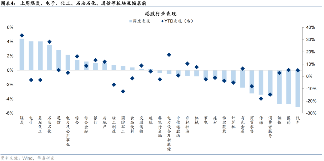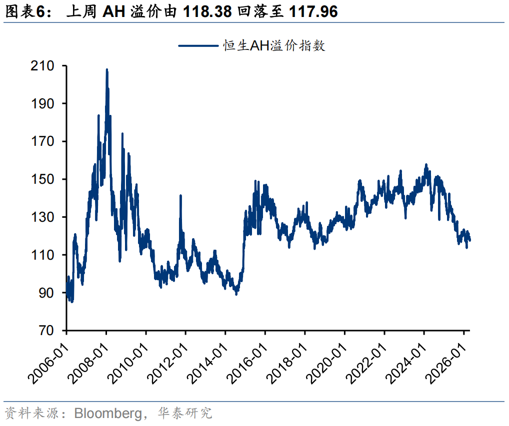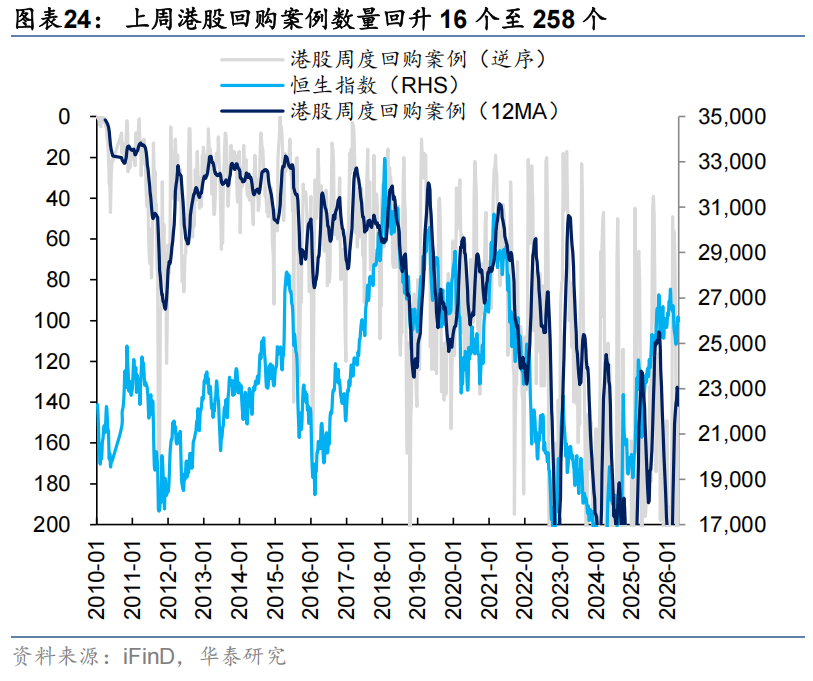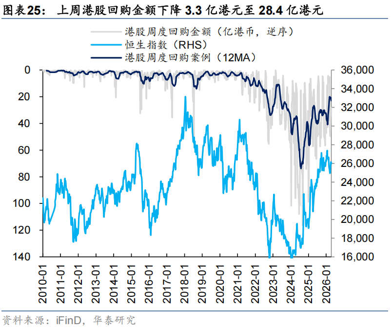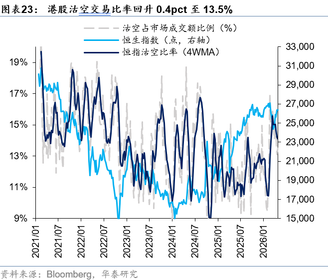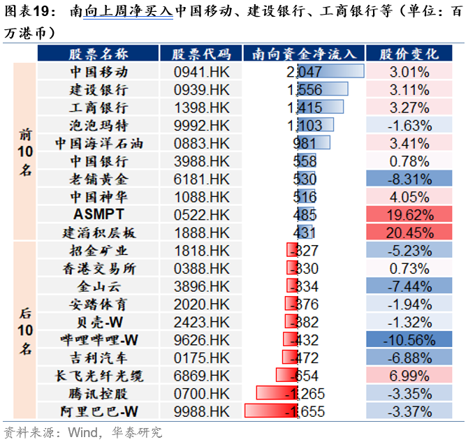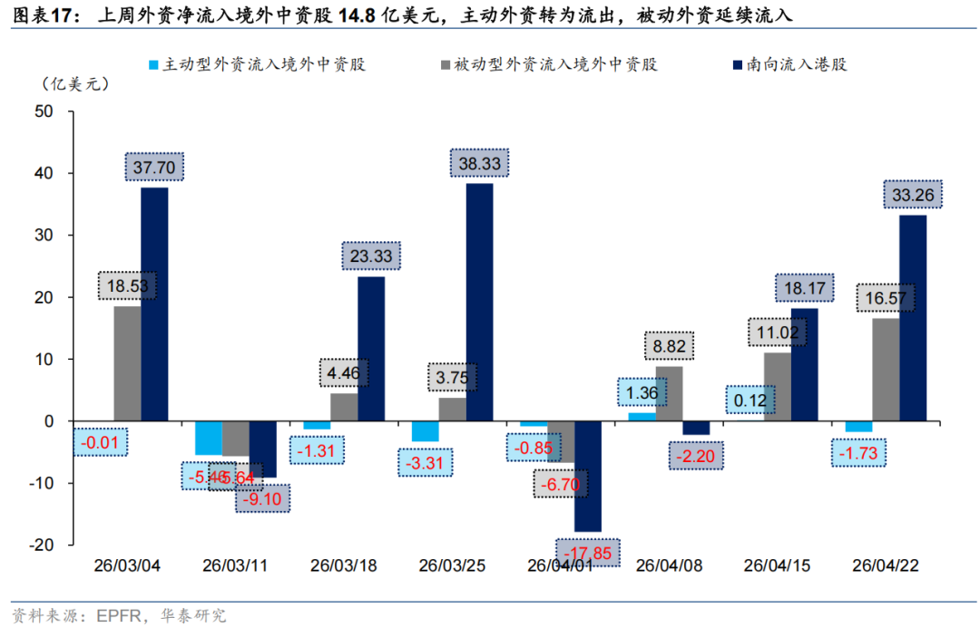 外资方面,截至周三,EPFR口径下外资净流入港股11.0亿美元(前一周为净流入港股8.0亿美元),其中主动外资净流出1.4亿美元,被动外资净流入12.4亿美元;沽空方面,最新一期港股沽空交易比例/持仓比率+0.4pct/-0.02pct至13.5%/2.36%,整体变动不大;南向方面,上周南向净流入港股168亿港币,较前一周净流入258亿港币有所放缓,银行、电子、通信、石油石化、煤炭等板块流入排名靠前。