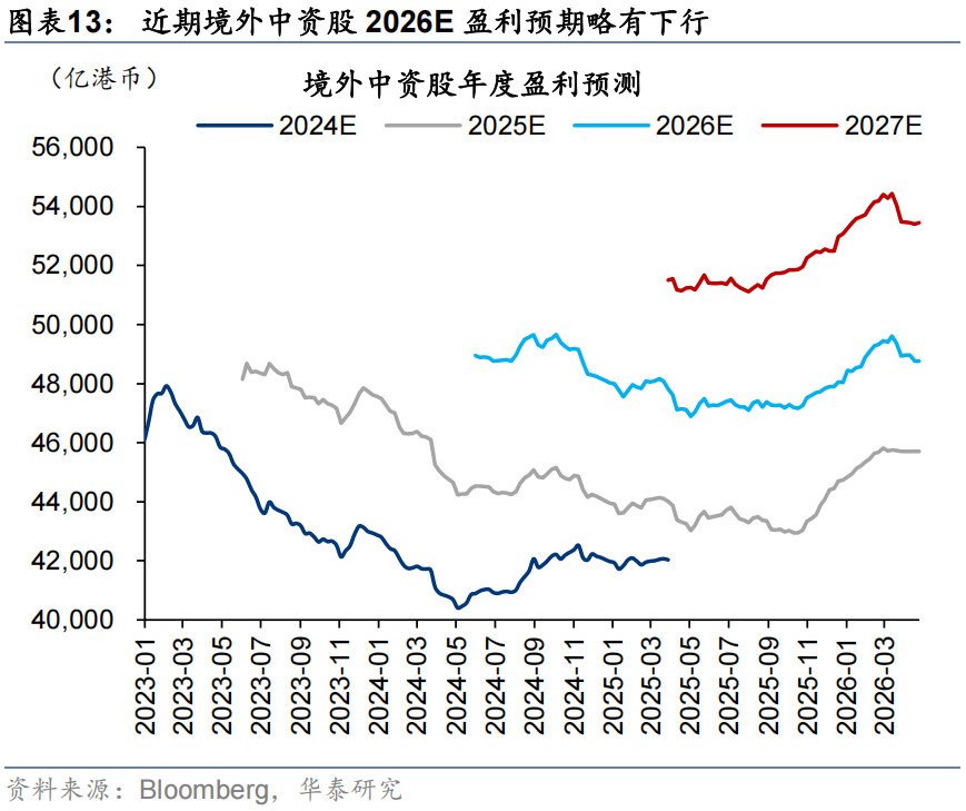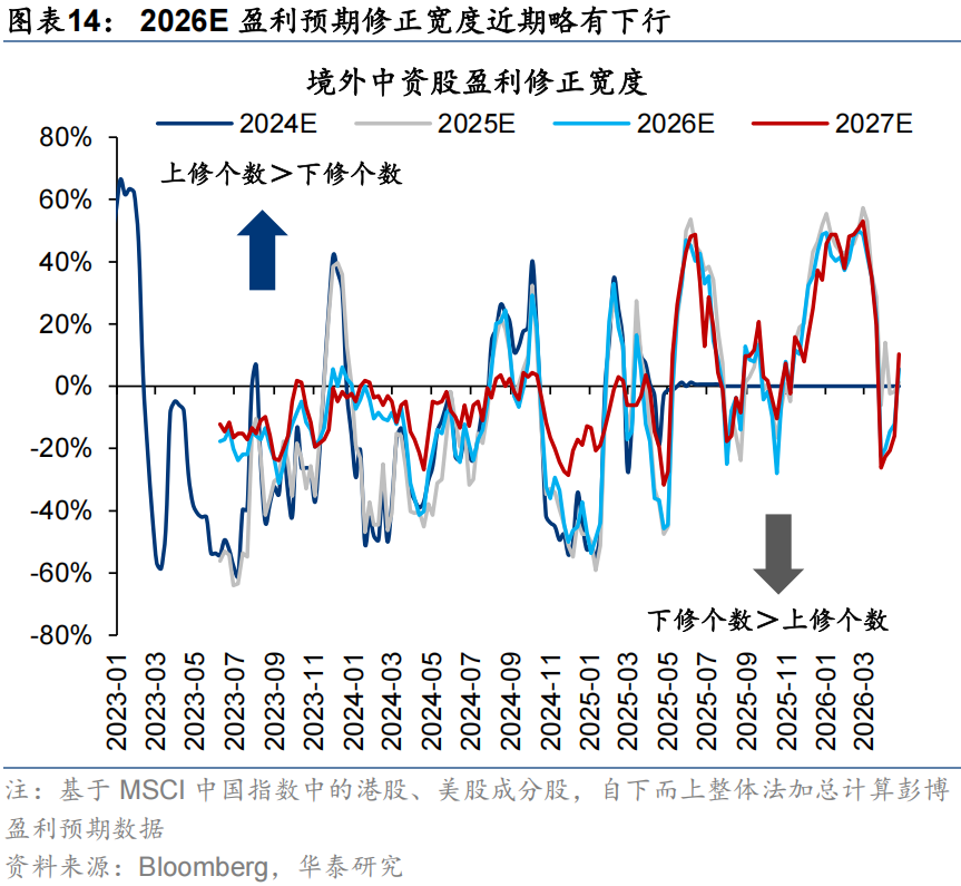 港股非金融彭博预期未来12个月盈利(简称盈利预期)近4周下修0.7%,近1周上修0.8%。热点板块中,高股息盈利预期上行加速,近1周上修3%,恒科延续筑底走势。行业层面,有色盈利上修趋势最强且宽度居前,锂矿和铝是上修幅度较大的细分品种。从周度变化看,半导体(2.2%)是兼具上修弹性与宽度的品种,房地产弹性居前(3.9%)但宽度不足。上周强势板块中,化工的盈利上修幅度相对小(0.3%)。
