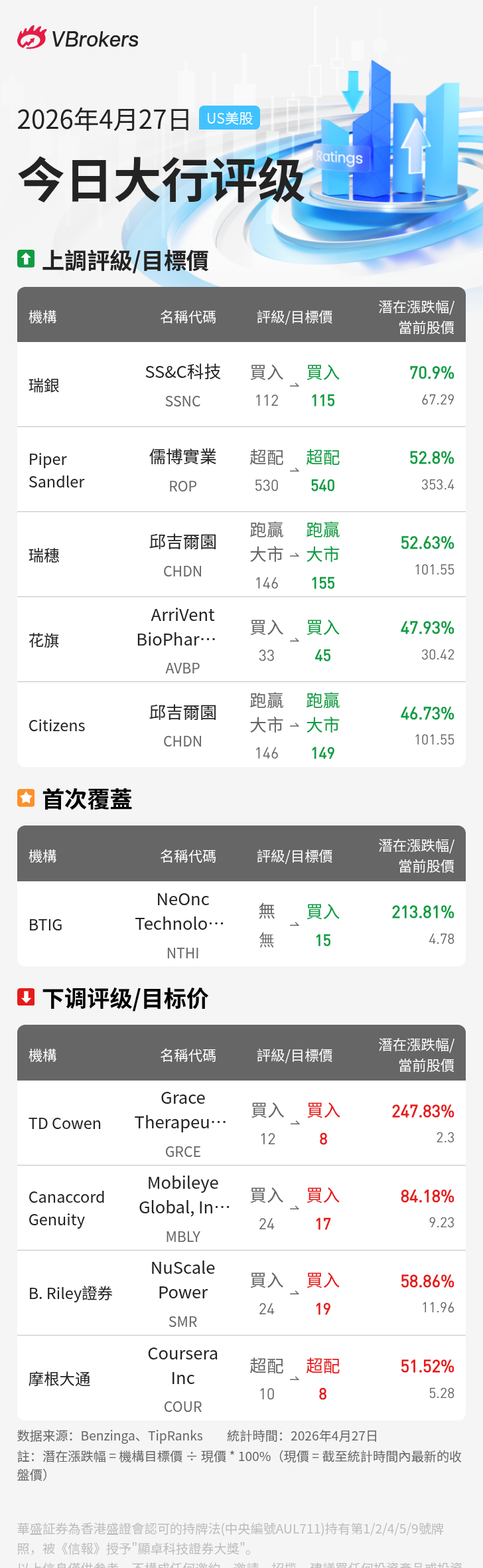 编者按:每日追踪华尔街最新评级与目标价,挖掘潜力股投资机会。