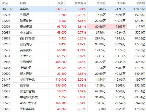 澜起科技涨逾10%,今日将公布Q1财报,中芯国际大涨近7%,兆易创新涨近4%,华虹半导体涨近3%。