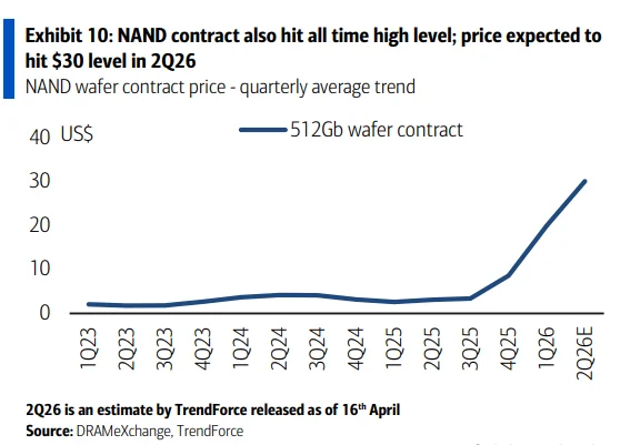 这一转变对市场的直接影响在于:存储行业的投资逻辑正从"AI溢价"向"传统供给短缺"切换。DRAM合同价格在2026年二季度已创历史新高,16Gb DDR5合同价格预计环比再涨逾20%;NAND合同价格同样处于历史高位,预计二季度将升至约30美元。传统存储的超强盈利能力,正在重塑芯片巨头的产能分配决策。